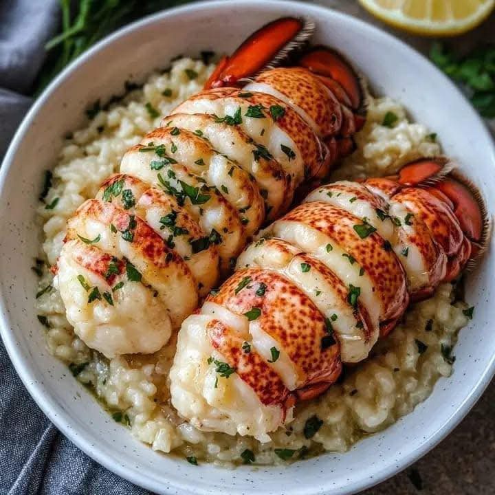 Serve: Arrange the lobster tails on a bed of the lemon orzo and scallop mixture. Add the roasted onion alongside. Provide melted garlic butter and lemon wedges for extra flavoring at the table.