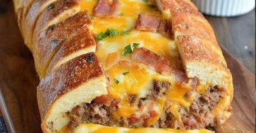 This savory, shareable baked treat is inspired by a cheeseburger, featuring seasoned ground beef, cheese, bacon, and pickles all rolled…
